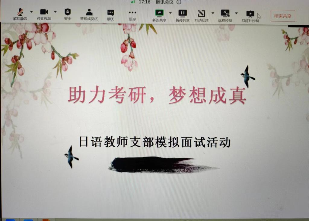 3月22日19:30,威廉希尔williamhill日语教师支部顺利举办2023年“助力考研,梦想成真”考研复试模拟面试活动。本次会议由支部书记王贝主持,邀请支部六位党员老师,旨在为学生考研复试提供演练的机会和针对性指导,提高学院考研升学率。