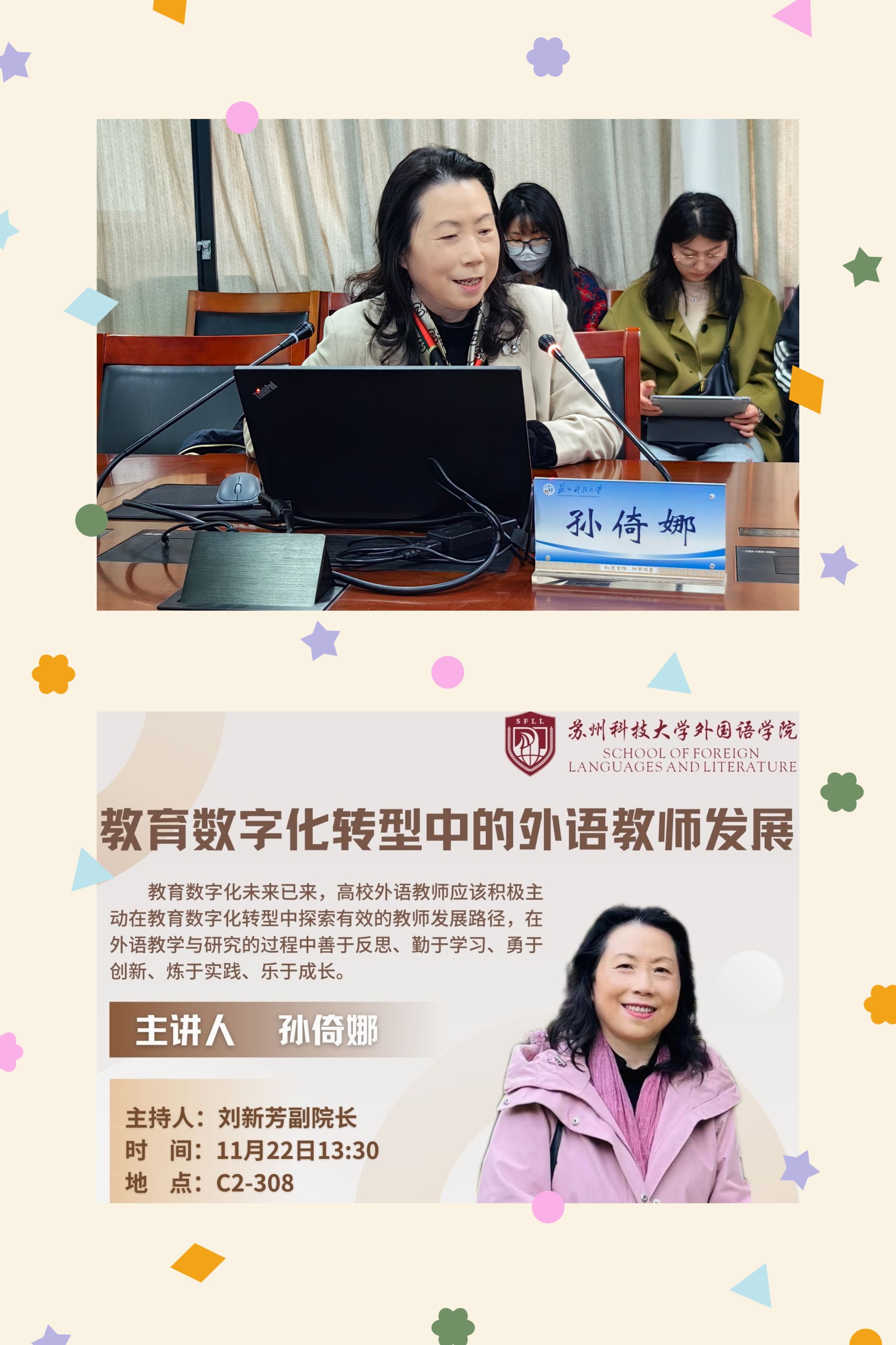 2023年11月22日下午,苏州大学孙倚娜教授应邀在C2-308为威廉希尔williamhill师生带来一场题为“教育数字化转型中的外语教师发展”的精彩讲座,讲座由刘新芳副院长主持。