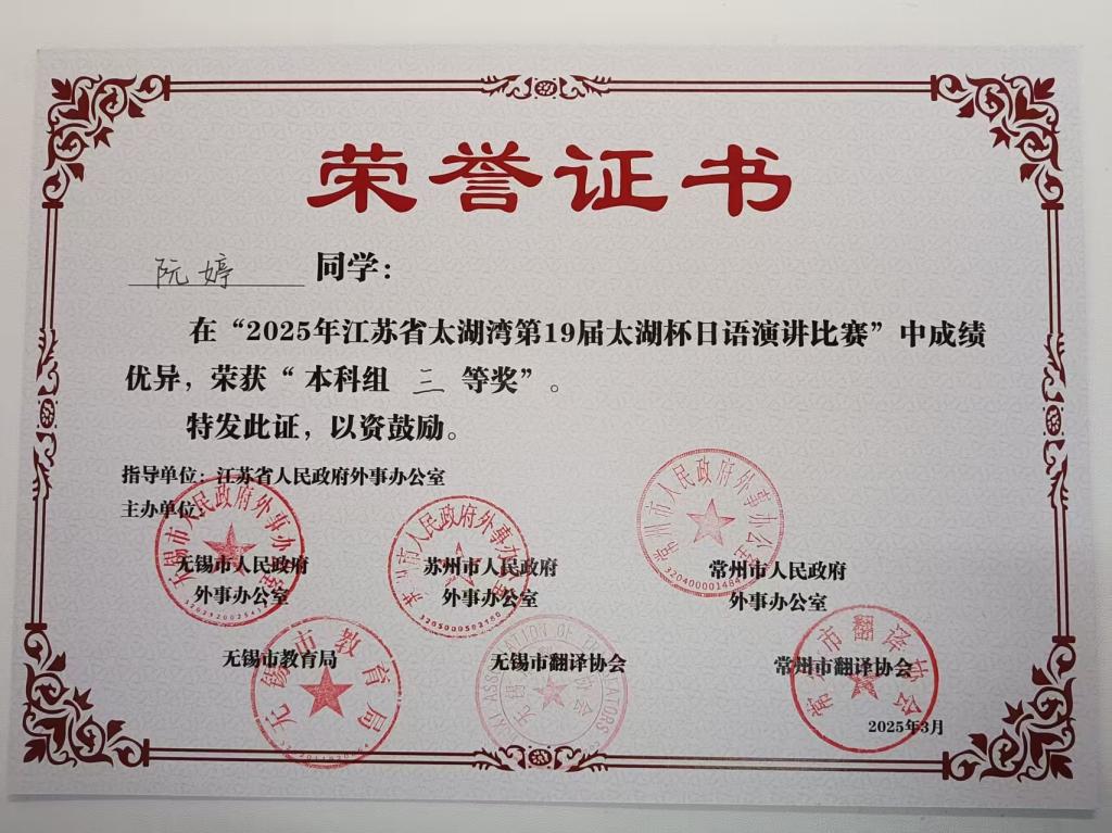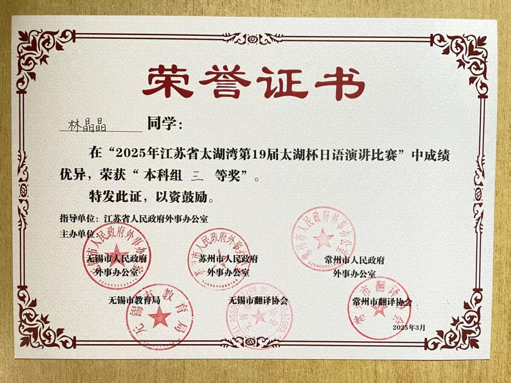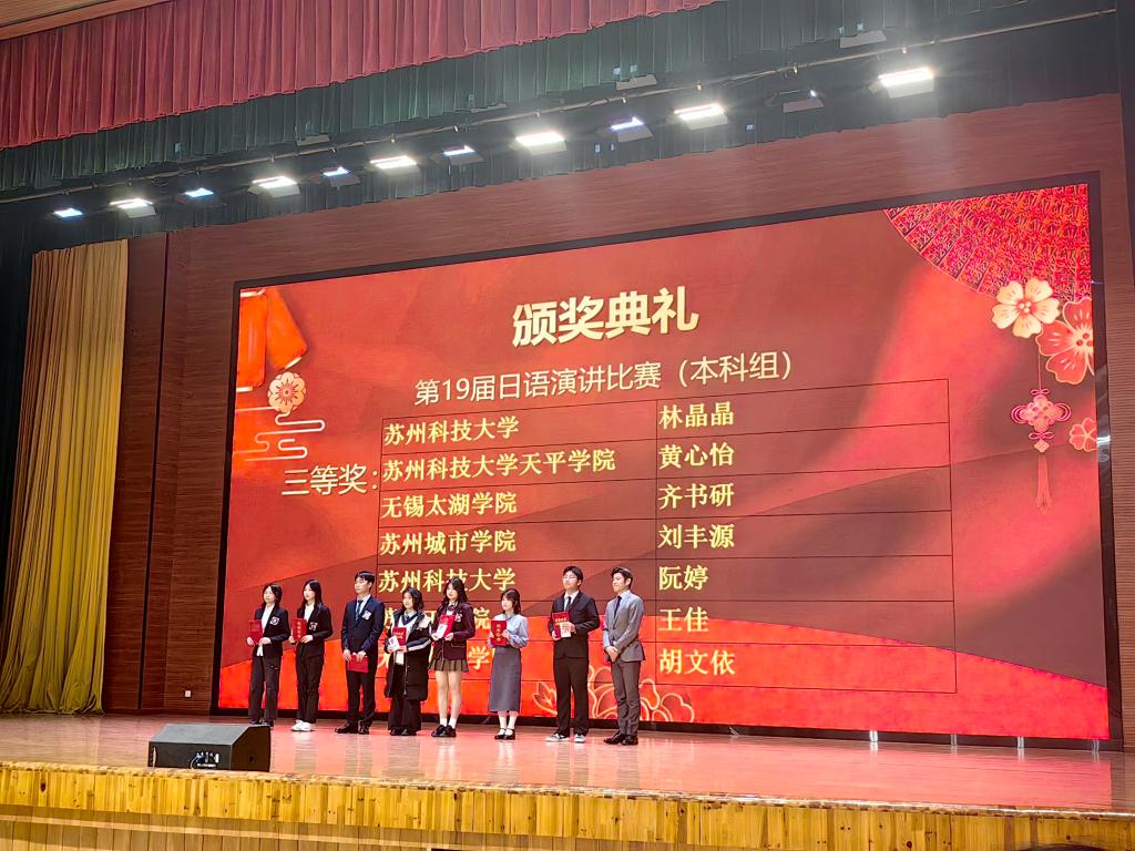 比赛吸引了苏锡常湖州等环太湖地区高校学生及社会人士参与,延续本科组、专科组、社会组的分组赛制。本科组共有21名选手晋级决赛,经过现场演讲、问答等环节的激烈比拼,我院日语系2023级学生林晶晶、阮婷表现出色,荣获“本科组三等奖”;指导教师郭璇、新野雅子、三原朱理获评“优秀指导教师奖”;williamhill中国获“优秀组织单位”称号。