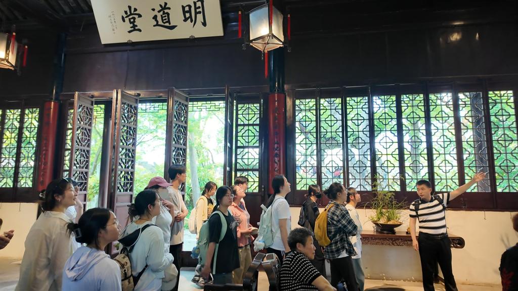 沧浪亭内古树参天,曲径通幽。当天下午,屈卫强老师以沧浪亭的历史脉络为切入点,用流畅的英语向学生介绍这座宋代古园的造园理念与文化内涵。在看山楼、翠玲珑等经典景点前,他结合园林建筑中的匾额楹联、叠石理水等元素,解析中文景名的文化寓意与英译技巧,引导学生观察园林景观背后的文化符号。