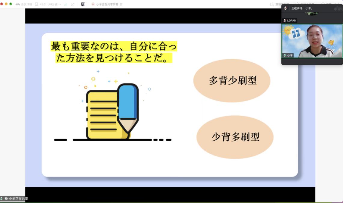 首先顾晶姝老师围绕N2考试的核心模块与高频考点,结合历年真题进行深入解析,传授了高效的备考策略与解题技巧,帮助学生们更好地理解考试要求和提升应试能力。施佳琪同学则结合自身N1、N2级别的备考经验,特别介绍了根据文理科思维差异选择“多背少刷”或“少背多刷”的个性化策略,强调了日专生充分利用课堂资源打牢基础的重要性,并针对各个模块提供了具体的冲刺建议和考前的心理调适方法,为同学们提供了宝贵的实战参考。