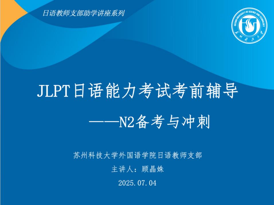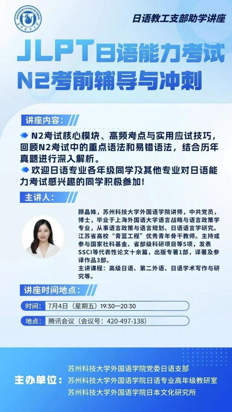 近日,日语系、日语教工支部共同举办了“JLPT日语能力考试N2考前辅导与冲刺”讲座。此次讲座由支部党员教师顾晶姝老师主讲,日语专业2212班的施佳琪同学进行备考经验分享,日语系教师、日语专业大一至大四学生、大学日语课程的学生以及有志于备考日本语能力考试的校内外学生参加了此次讲座,讲座由日语系系主任罗时光老师主持。