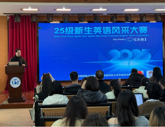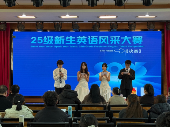 12月17日, 2025级新生英语风采大赛在学院五楼报告厅拉开帷幕。副院长(主持工作)綦亮、副院长王妍出席,大外部及英语系骨干教师担任评委。綦亮致辞肯定了本次大赛在赋能学生成长、厚植校园文化氛围中的重要价值,鼓励选手展风采,预祝大赛成功。