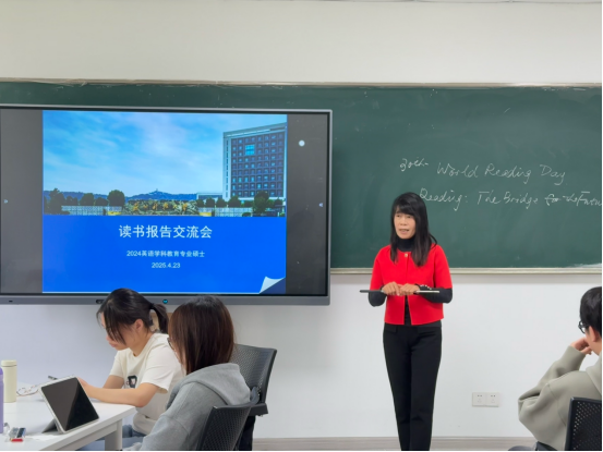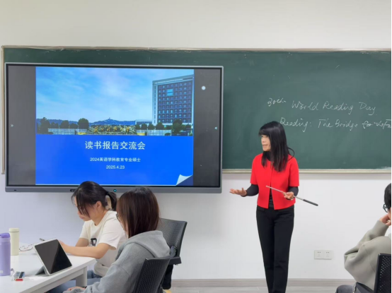高曦同学分享的书籍是《高中英语写作教学设计》,她从英语写作课的教学目的、教学方法和教学活动等方面为同学们介绍教师在高中英语写作课教学设计过程中应注意的问题。曹茜同学分享的书籍是《英语阅读与思维培养》,她为我们介绍了阅读教学与思维培养的关系,阅读与思维相辅相成,阅读为思维提供材料,思维则通过对材料的加工促进更深层次的阅读理解。赵子墨同学分享的书籍是《核心素养下的英语教学理念与实践》,她从作者简介、全书框架及主要内容几个方面做出了主要介绍,最后,提出了本书对英语专业研究生的启发与感悟。白雪同学分享的书籍是《英语教师课堂话语分析》,她将书中强调的一些原则与实际教学出现的问题相结合,从自己的角度提出了一些教学建议,倡议大家在英语课堂上注重教师用语的真实性、互动性、逻辑性和规范性。张梓仪同学分享的书籍是《外语教学问卷调查法》,她为我们分享了这本书的整体框架、主要内容,并提出该使用研究方法过程中如何设计问卷是同学们需要关注的一个重要因素。刘舒雅同学分享的书籍是《英语教学中的语篇分析》,她分析了不同语篇的特定结构,文体特征和表达方式,还分享了一些课堂教学设计实例。朱凯丽分享的书籍是《英语教师行动研究》,她介绍了行动研究的基础理论、英语教学中的常见问题以及行动研究的设计与实施过程,帮助同学们更好地理解和掌握行动研究方法,提升教学实践能力和专业素养。薛淼分享的书籍是《英语阅读教学中的读写整合:铺垫与输出》,她提出读写结合课与其他课的区别在于这里的阅读的终极目标是为了更好地写,因此怎么读、读什么是教师需要思考的事情,同时在这个过程中要注意多元性评价,尤其是形成性评价的实施。