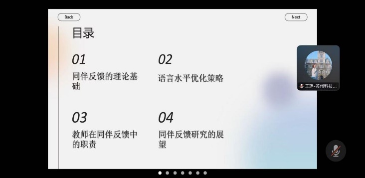 刘婧婧分享了《核心素养下的英语教学理念与实践》,她从核心素养与课程体系、促进学生思维能力发展的途径等方面分享了这本书的主要内容。吴凝希分享了《英语写作中优化的同伴反馈研究》,她分析了同伴反馈理论基础、教师在同伴反馈中的职责,提出了语言水平优化策略及对同伴反馈研究的展望。唐卉分享了《英语问读教学中的读后活动:设计与反思》,她提出了在阅读教学实践中采用“读前—一读时—一读后”三阶段阅读模式,每一阶段都有具体的目的及相应的阅读活动。李哲分享的书籍是《备课专业化》,她介绍了备课专业化的概念,提出了自己的读书感悟。徐灵分享的书籍是《英语阅读与思维培养》,她从作者简介、整体框架、书本的主要内容进行介绍,提出了自己的感悟。王书雯分享了《英语阅读教学中的读后活动:设计与实施》,她从“我们的主题”、“我们的困惑”、“我们的行动”、“我们的思考”这几个方面进行汇报。华东分享的书籍是《外语教学问卷调查法》,她汇报了这本书的语料库构建与应用、话语分析的理论框架、并提出了语料库在教学中的应用。