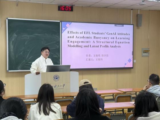 陈宇昂与王俊玮两位学长都是研究生国家奖学金获得者,二者的研究兴趣聚焦于“生成式AI技术辅助语言教学”领域,研究成果都发表为SSCI一区论文。在这次沙龙上,两位学长分享了他们如何在读书中发现研究问题、确立研究选题及高水平论文撰写发表过程的宝贵经验,激励参会同学们刻苦钻研、产出高质量成果的信心。