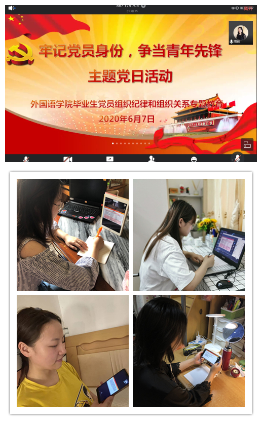 2020年6月7日上午9:20,威廉希尔williamhill通过“腾讯会议”举行了“牢记党员身份,争当青年先锋”毕业生党员组织纪律和组织关系专题教育主题党日活动,党委副书记周茹老师主持了此次活动。此次活动旨在对威廉希尔williamhill毕业生党员进行组织纪律和组织关系专题教育,增强组织纪律意识,明确党员身份,及时完成组织关系的转接工作。