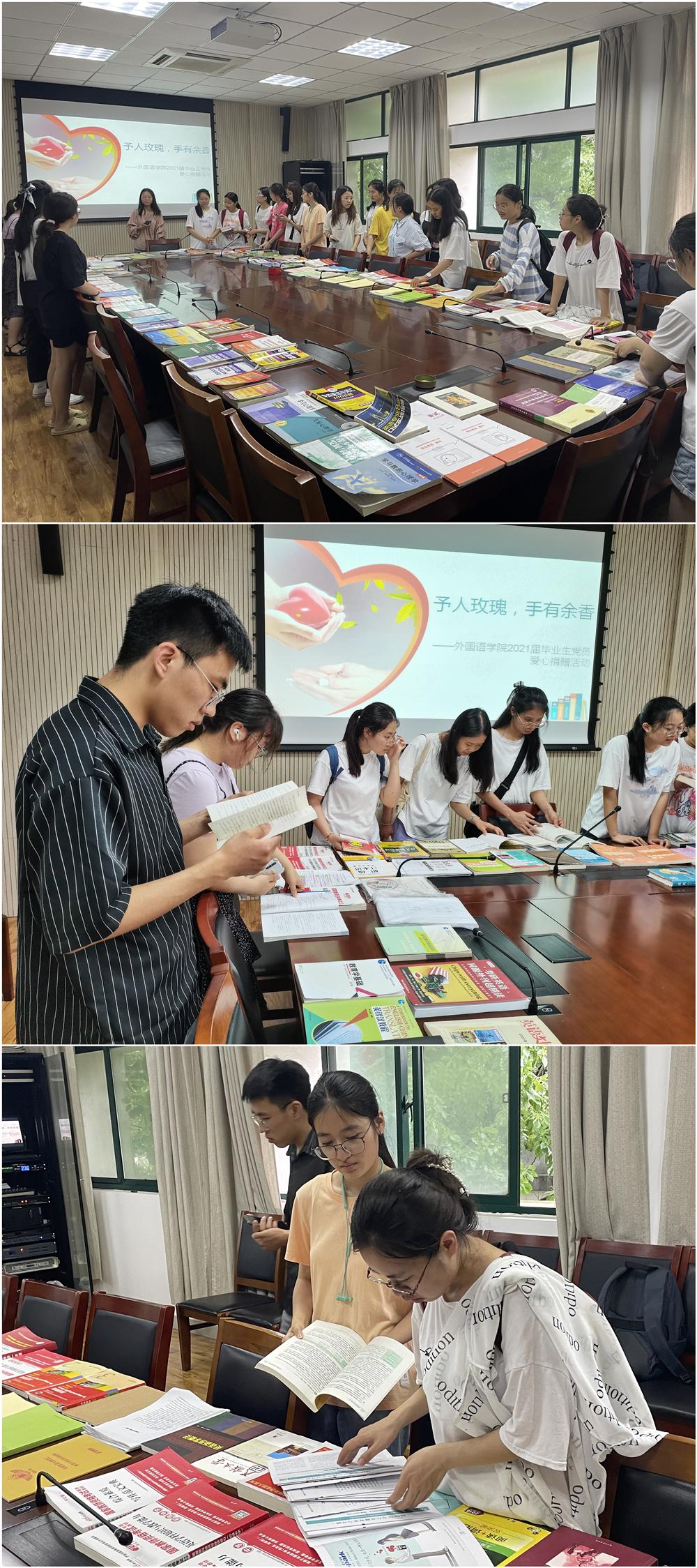 在毕业生离校前夕,我院毕业生党员为学弟学妹们捐赠了100余本在校期间的书籍或学习资料,主要有专四专八复习丛书、英语词汇书、教师资格证复习用书、英语专业教材用书、英文原版小说、考研资料等。这些书籍都承载了毕业生党员满满的爱心,寄托了对学弟学妹们的祝福和期望。在活动过程中,在场的毕业生党员还和大家交流了学习心得,学弟学妹们不仅挑选到了合适自己的学习资料,也收获了许多学习经验。参加活动的同学均对捐书的学长学姐们表示了最真挚的感谢,并表示在以后的学习生活中,会更加努力,也会利用空闲时间多多阅读,丰富知识。
