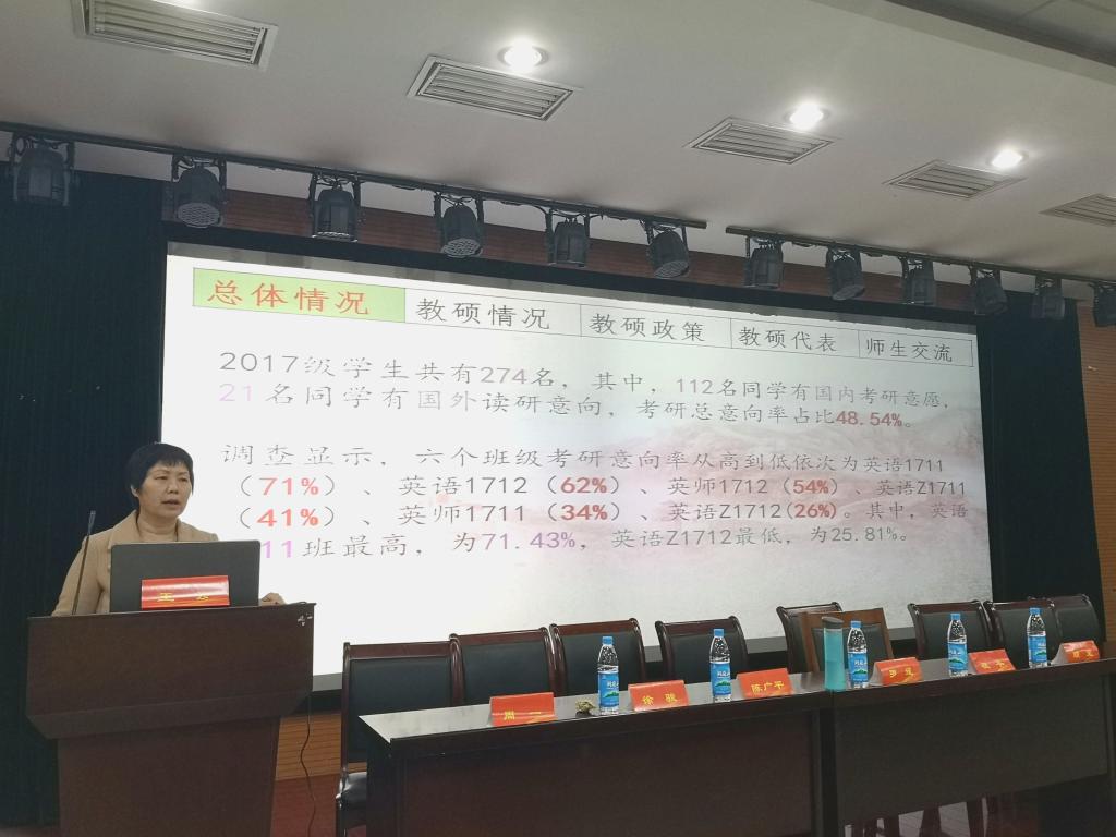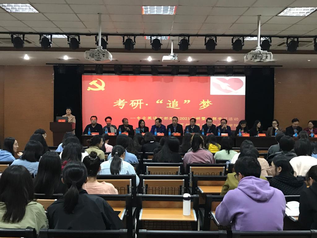 为进一步激发我校威廉希尔williamhill学生的考研热情,为考研学子提供更多的支持和帮助,威廉希尔williamhill专业英语支部于2020年10月28日晚6:30-8:00在石湖校区C2五楼报告厅举办了以“考研∙追梦”为主题的专题党日活动,学院党委书记顾坚、院长郭富强、副书记周茹、副院长綦亮和英语支部全体党员老师出席了此次活动。活动对象涵盖威廉希尔williamhill大一、大二、大三具有考研意向的学生,以及已报名即将参加2021全国研究生考试的各位莘莘学子。
