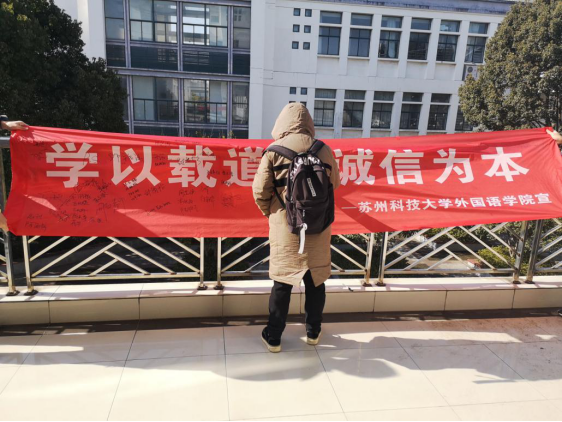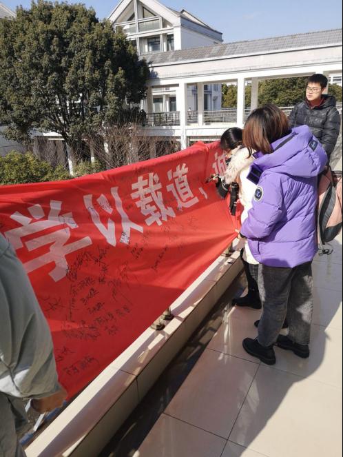 会议伊始,谭亲平老师带领所有学生学习《学生手册》有关考试违纪和作弊处理的条例,并一一对其进行解读,强调遵守考试纪律的重要性。接着,谭亲平老师讲述了本校相关违纪作弊案例及当事人事后得到的严厉惩罚,引起同学们对诚信考试的高度重视。在专题年级会结束后,谭亲平老师组织全体参会学生手抄《诚信考试承诺书》,并在印有"学以载道,诚信为本"的横幅上签字,营造全体学生积极迎考的良好氛围。