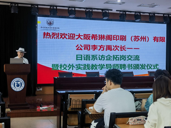 日语系主任罗时光首先致欢迎词,之后学工办主任陈碧榭为大阪希琳阁(苏州)有限公司总经理藤谷尚词和管理部次长李方禹颁发了校外实践教学导师聘书。最后请李方禹次长为日语系师生作了关于日资企业介绍及职业生涯规划的精彩讲座和经验分享。李方禹次长以日本OSP集团及大阪希琳阁(苏州)有限公司为例,给师生们详细介绍了日本大型跨国公司在中国和全球的发展状况及其较为成熟的企业文化与管理机制,指出在这样的全球大型企业工作具有较好、较稳定的未来成长和进升的通道,为日语专业师生展示了本专业及同学未来在日本大型企业就业的广泛市场前景,鼓舞了日语专业同学对未来在企业就业的信心;并就如何应聘日本全球大型跨国公司及未来职业生涯规划进行了宝贵的经验分享,极大地开拓了师生们的眼界和思路,为本院日语专业教学及2023人才培养方案的进一步修订提供了有益的市场经验和思路参考,访企拓岗交流活动取得圆满成功。
