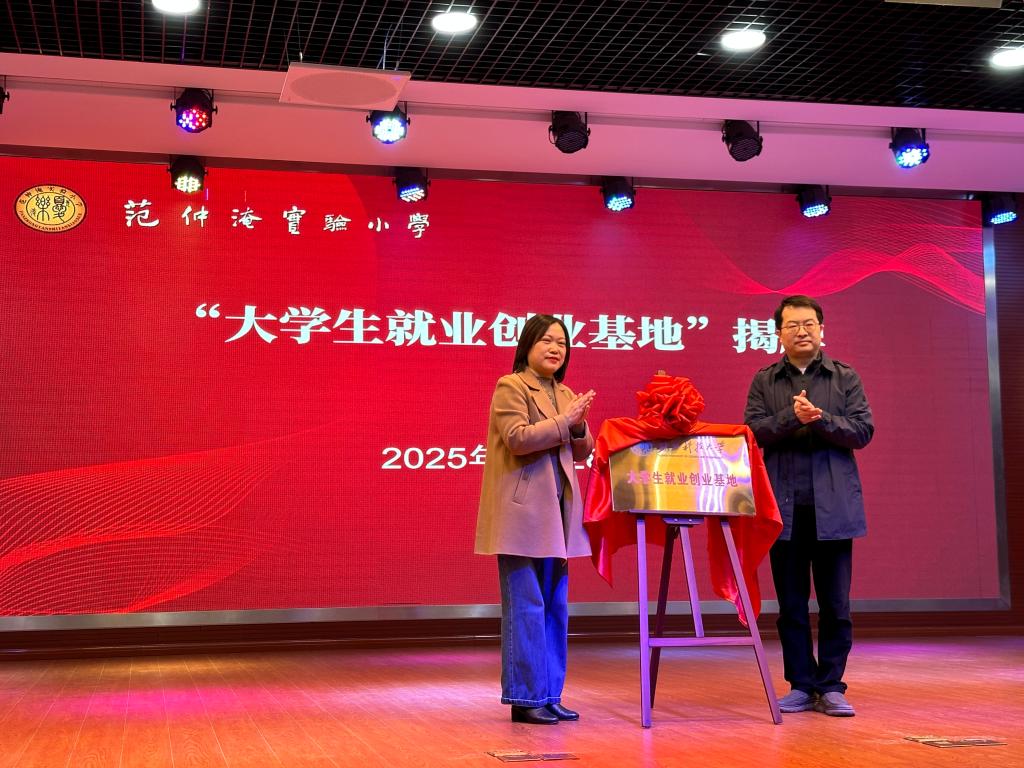 张伟炜局长在致辞中指出在AI时代背景下,教师需不断提升自身能力以适应教育变革。威廉希尔williamhill与范仲淹实验小学的深化合作,是提升教师队伍素质、推动教育创新实践的重要途径,将为教师发展和学生成长带来新的机遇。綦亮院长在发言中介绍了学院的优势与特色,学院拥有雄厚的师资力量、先进的教学理念和丰富的实践资源,在人才培养和科研方面成果显著,两校合作不仅能为大学生提供了就业的实践平台,也为构建教研共同体提供有力支持。郑建英校长表示,青年教师要传承和弘扬范仲淹精神,两校合作将为高质量就业助力、为高质量发展聚力、为高质量人才努力。最后,綦亮院长和郑建英校长为“大学生就业创业基地”揭牌。
