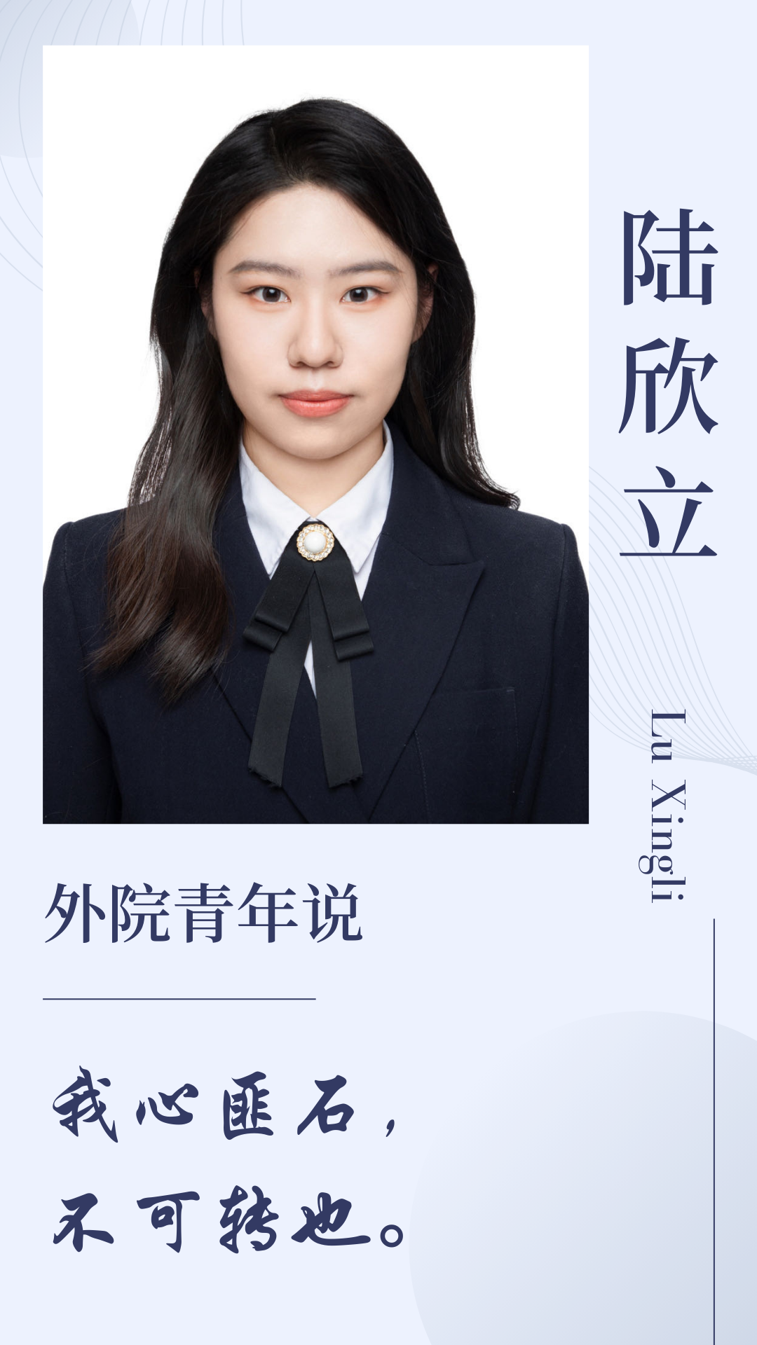 自入学以来,陆欣立始终以谦虚谨慎的态度面对一切,拥抱一切。她相信,人生是旷野,不是轨道。作为青年党员,她力求做到躬身、动心、锐志、担责,从心所欲而不逾矩,使个人的成长与社会的发展同呼吸、共脉搏,懂得在细碎的生活里找自洽,在人生当下取一瓢饮却要眺望山海,希冀如同歌中总要唱到“过往值得了现在”。