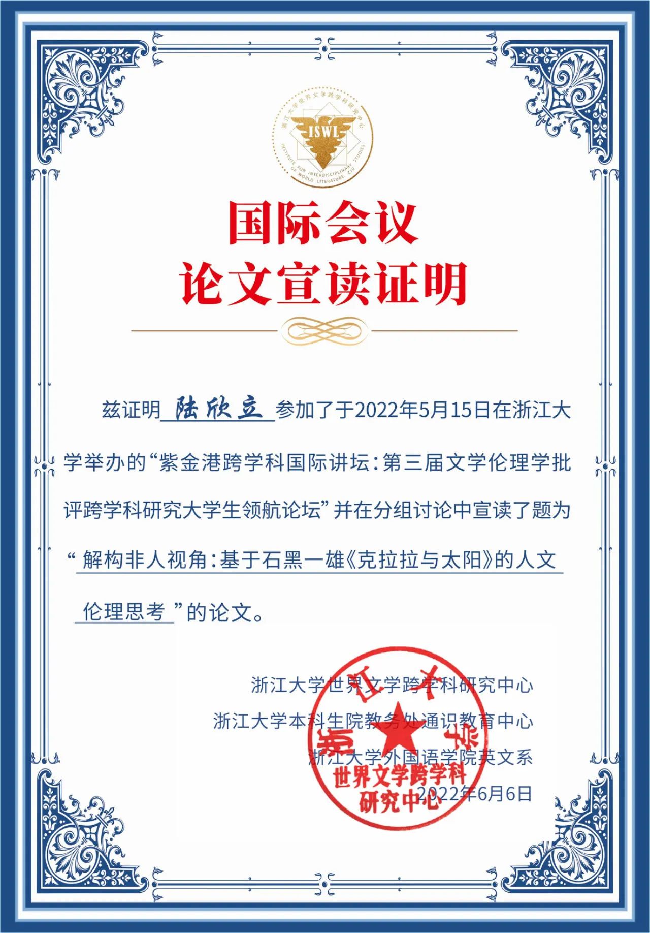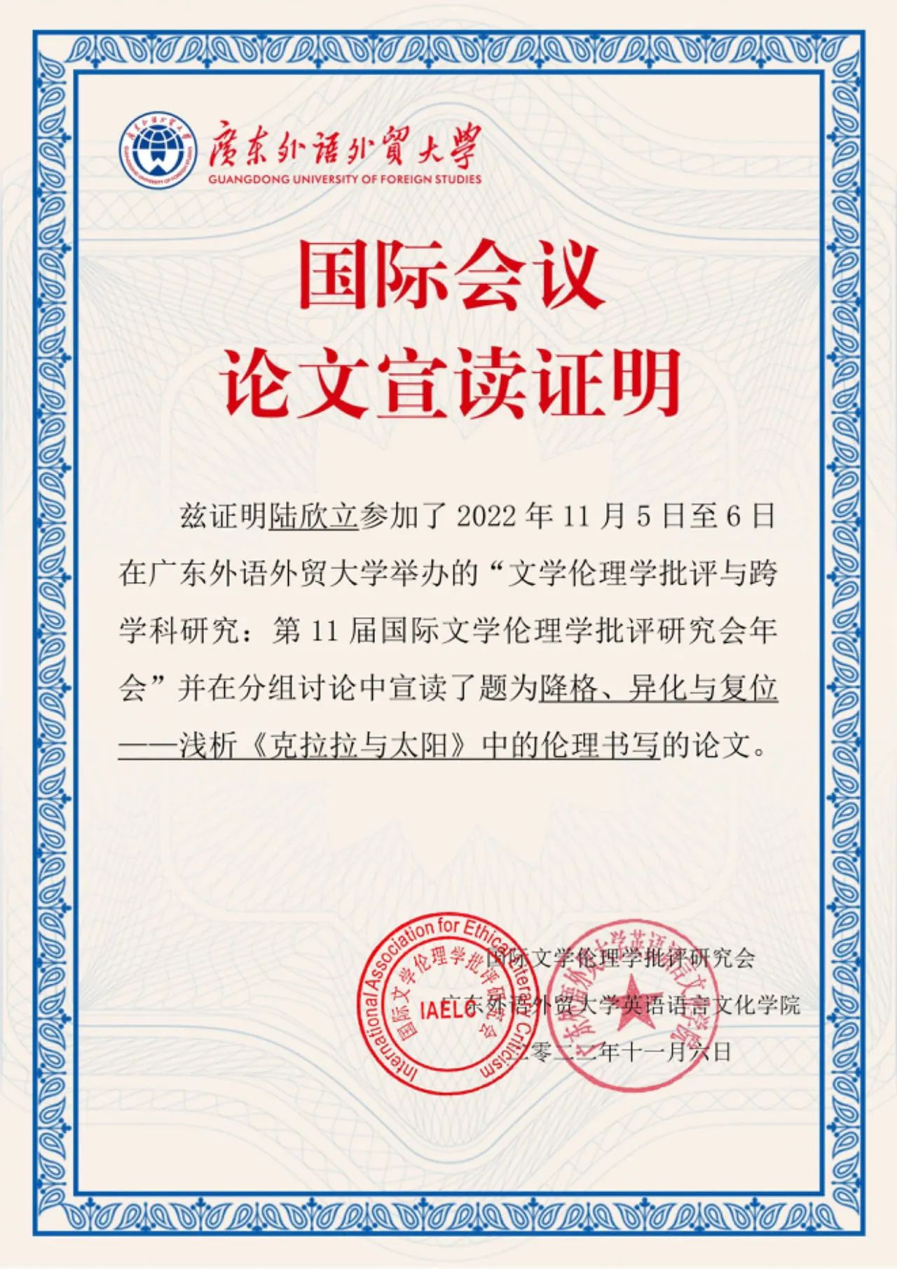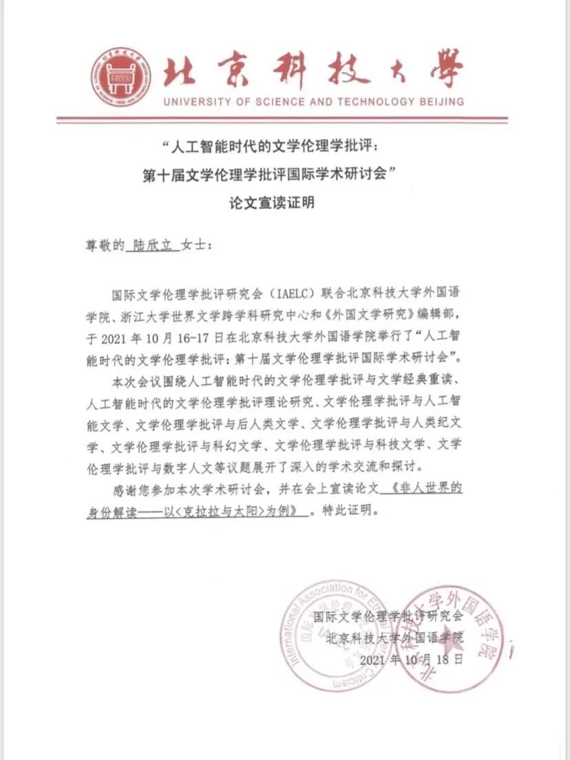 感恩于郭雯老师给予的机会,让一位“科研小白”有了看见世界的窗口。以《非人叙事与世界想象:科技与人文的对话》为题,她开始了科研初探。作为项目的第一负责人,陆欣立和成员们一道从非人主体的独特视角切入,找寻后现代科幻小说中潜藏着的自我认知答案。她也有幸在国际第十届、第十一届文学伦理学批评学术研讨会、第三届文学伦理学批评跨学科研究大学生领航论坛、首届全国本科生当代英语文学前沿研究学术论坛作汇报。学术论坛中百家争鸣观点的碰撞,也让她更好地了解“非人”如何参与到人类自身主体性建构过程、如何使人类与自身、与他者、与世界万物更好地融通。
