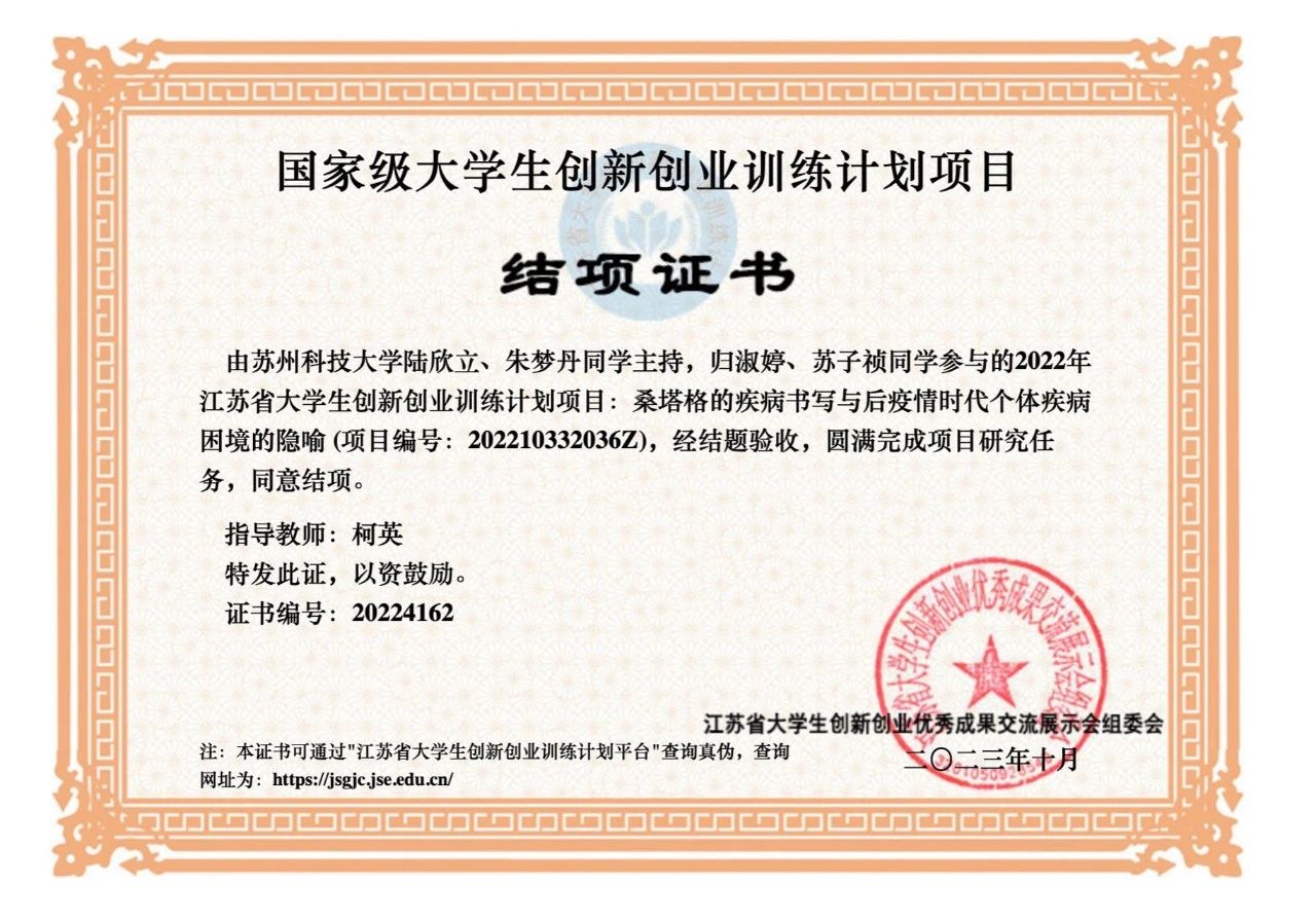 尤记得2022年的5月,一次组队邀请打破了日常的平静。她和小伙伴的选题《桑塔格的疾病书写与后疫情时代个体疾病困境的隐喻》成功申请到了国家级大学生创新创业项目。她们聚焦于美国女作家苏珊·桑塔格,通过研究疾病的“隐喻”符号,揭开病痛表征的面纱,构建正确道德判断与伦理态度,回归人性共同体意识,实现个体自觉肉身与灵魂双在场。她回忆到,“论文写作的过程是很艰难的,需要‘带着镣铐跳舞’,非常感谢柯英老师对于项目的打磨以及情绪价值的肯定。她给我们的是清风般绵长的温柔,在她身上我能看见岁月沉淀后的自洽。”