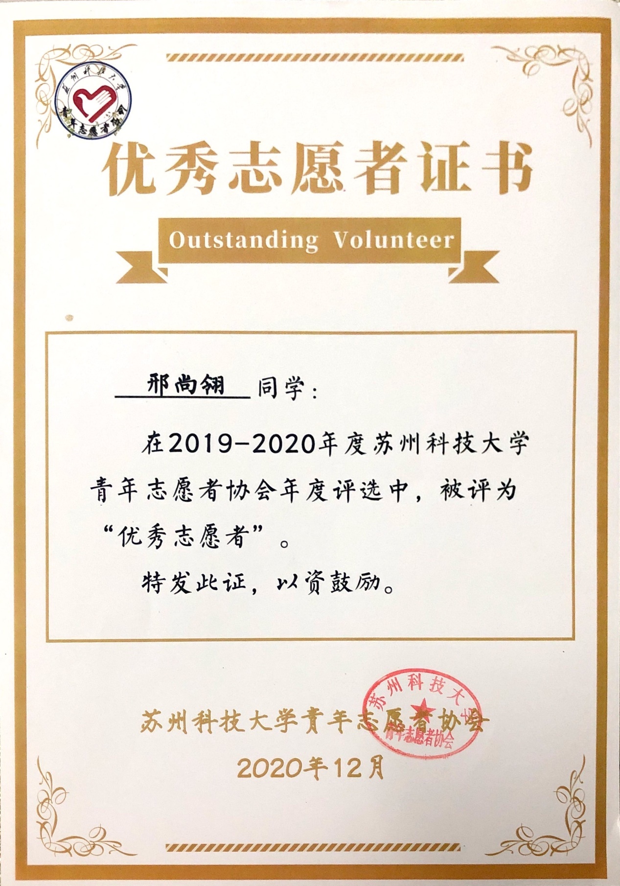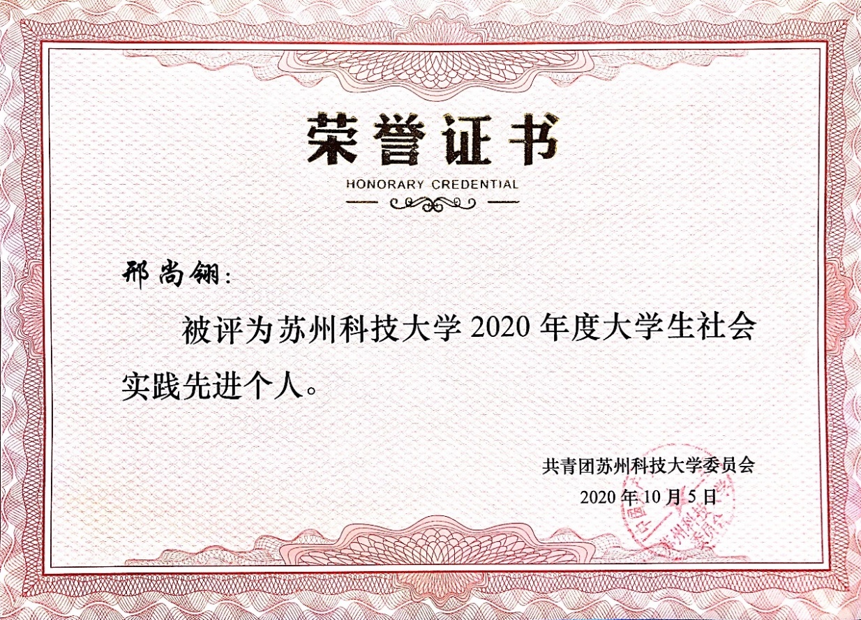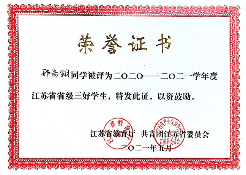 获校“综合特等奖学金”、校“综合一等奖学金”、英孚教育奖学金、江苏省“省级三好学生”、长三角高校书院联盟党史故事联讲竞赛一等奖、长三角高校书院联盟红色定向积分赛二等奖、江苏省大中专学生暑期“三下乡”社会实践活动“优秀团队”(队长)、江苏省青少年高校组“优秀模拟政协提案作品”、校“青年五四奖章”、校优秀学生干部(标兵)、校三好学生(标兵)、校优秀团干部、校优秀团员、校优秀志愿者、校社会工作奖、校文体活动奖、校社会实践“十佳团队”、校“优秀调研报告”、校社会实践“先进个人”、中国啦啦操俱乐部联赛第一名、江苏省全民运动会啦啦操一等奖、江苏省大学生艺术舞蹈展演三等奖、苏州市第十五届运动会啦啦操第一名、“壮丽70年,奋斗新时代”苏州高校舞蹈展演优秀剧目奖、校第十九届及二十一届运动会啦啦操比赛第一名、校第二届新星才艺大赛一等奖、校“学信杯”模拟面试大赛二等奖、校党团知识竞赛三等奖、敬文书院新生辩论赛亚军、江苏省第二十六届高校“校长杯”乒乓球比赛校级优秀志愿者、校“学党史、强信念、跟党走”师生大合唱校级优秀志愿者、校园文化精品培育名录库之“携手,伴夕”项目优秀志愿者。