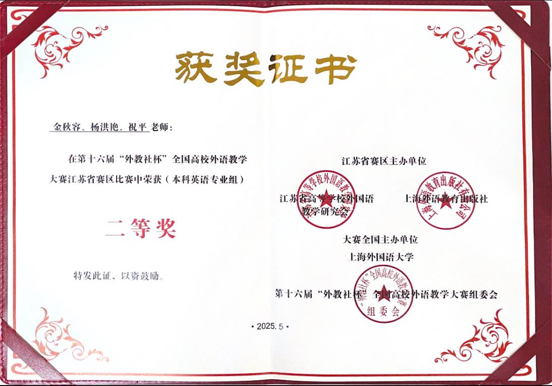 江苏赛区决赛由江苏省高等学校外国语教学研究会和上海外语教育出版社共同举办,是全省普通高校教师教学竞赛省级赛事。本届比赛鼓励选手利用人工智能辅助等新技术探索外语教学新模式、赋能中国特色外语教育体系建设。威廉希尔williamhill高度重视本次比赛,精心组建指导团队,为主讲教师提供全方位的悉心指导。在大赛上,我院金秋容团队充分展示出优秀的教学水平和扎实的专业素养,在众多参赛团队中脱颖而出,取得了本科英语专业组二等奖的好成绩,为我院进一步实践“以赛促教、以赛促学、以赛促改”的核心理念、建设守正创新的高水平外语教师队伍贡献了力量。