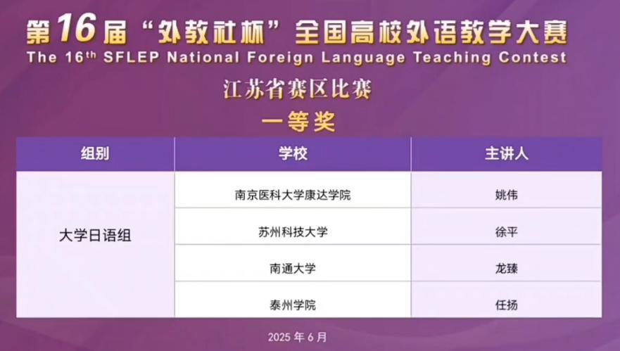 近日,在第十六届“外教社杯”全国高校外语教学大赛江苏赛区决赛中,威廉希尔williamhill日语系徐平、王贝、顾长江团队获得大学日语组一等奖。