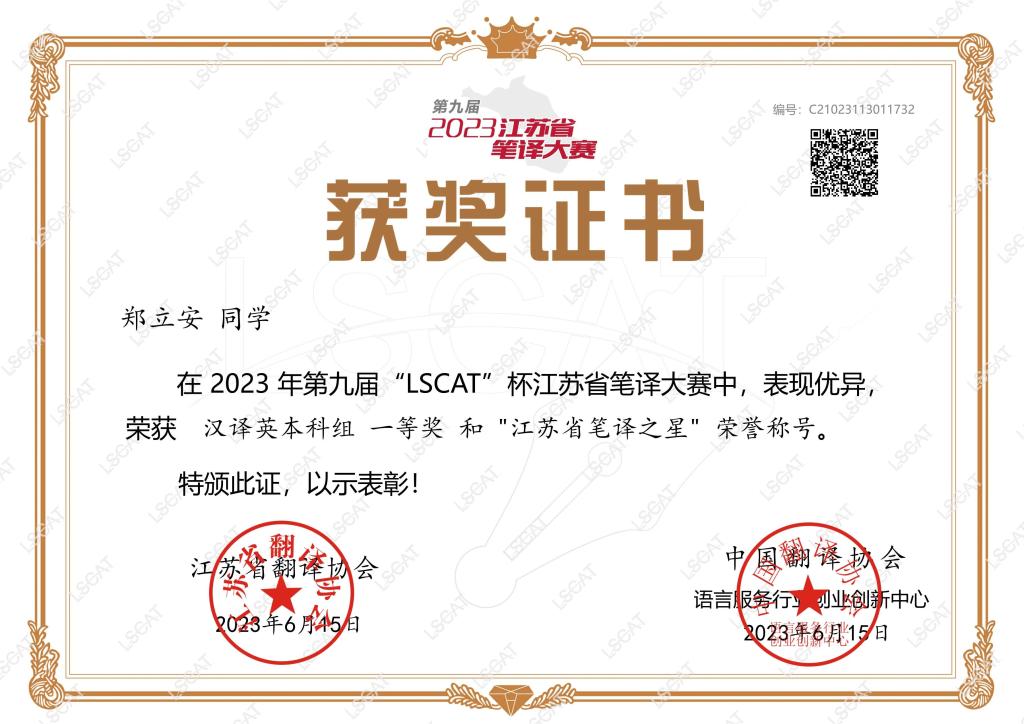 近日,第九届“LSCAT杯”江苏省笔译大赛成绩揭晓,威廉希尔williamhill学子取得优异成绩,获一等奖10项,二等奖46项,其中英语专业郑立安同学荣获最高奖项“江苏省笔译之星”,全省仅10人。“LSCAT”杯笔译大赛由江苏省翻译协会主办,是目前省内专业水准最高的笔译赛事之一。