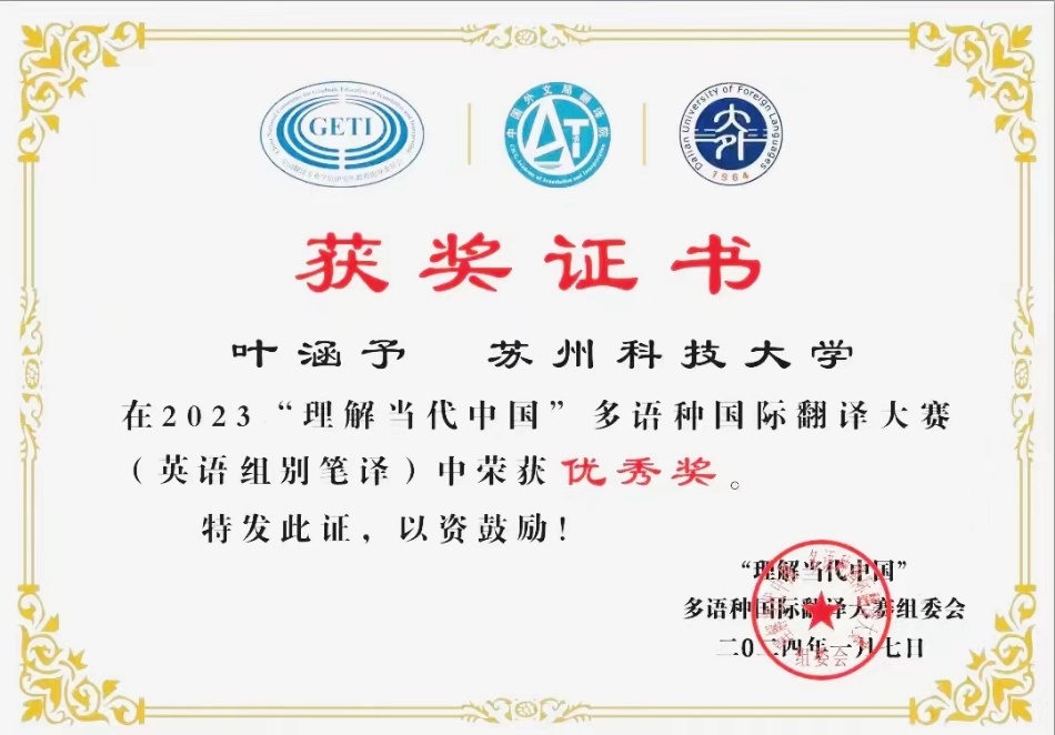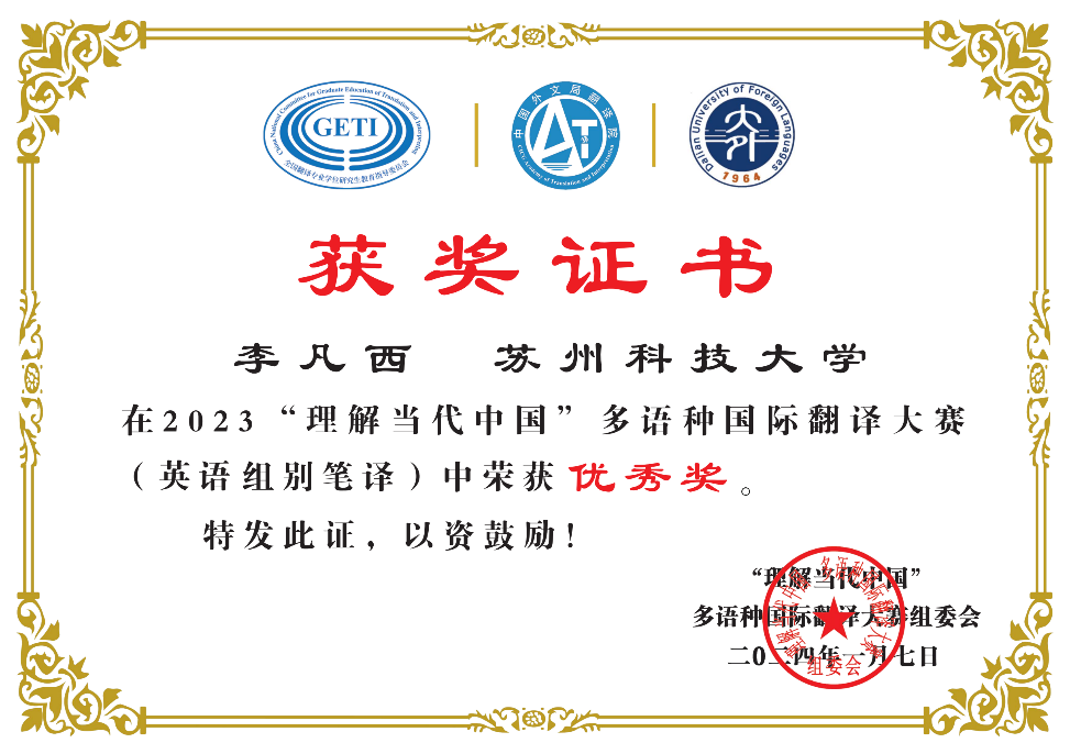我院的5位同学在“理解当代中国”多语种国际翻译大赛中取得的优异,为学校增光添彩,为我院英语笔译专业的发展奠定了坚实基础。未来,我们将继续努力,通过参与类似国际比赛,将拓展学生的国际视野,提高跨文化沟通能力,让MTI学子更好地适应全球化背景下的翻译需求。