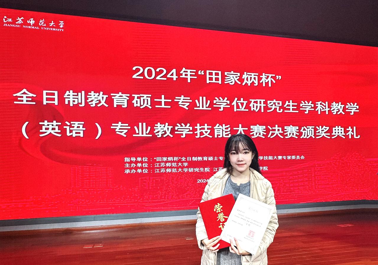 11月8日至11月10日,2024年全国“田家炳杯”全日制教育硕士专业学位研究生学科教学(英语)专业教学技能大赛决赛暨新时代学科教学(英语)专业硕士人才培养研讨会在江苏师范大学成功举办,我院在该项赛事中取得优异成绩。经过激烈角逐,23级学科教学(英语)专业研究生逯登莎荣获一等奖,指导教师范丽娟教授获得优秀指导教师奖。