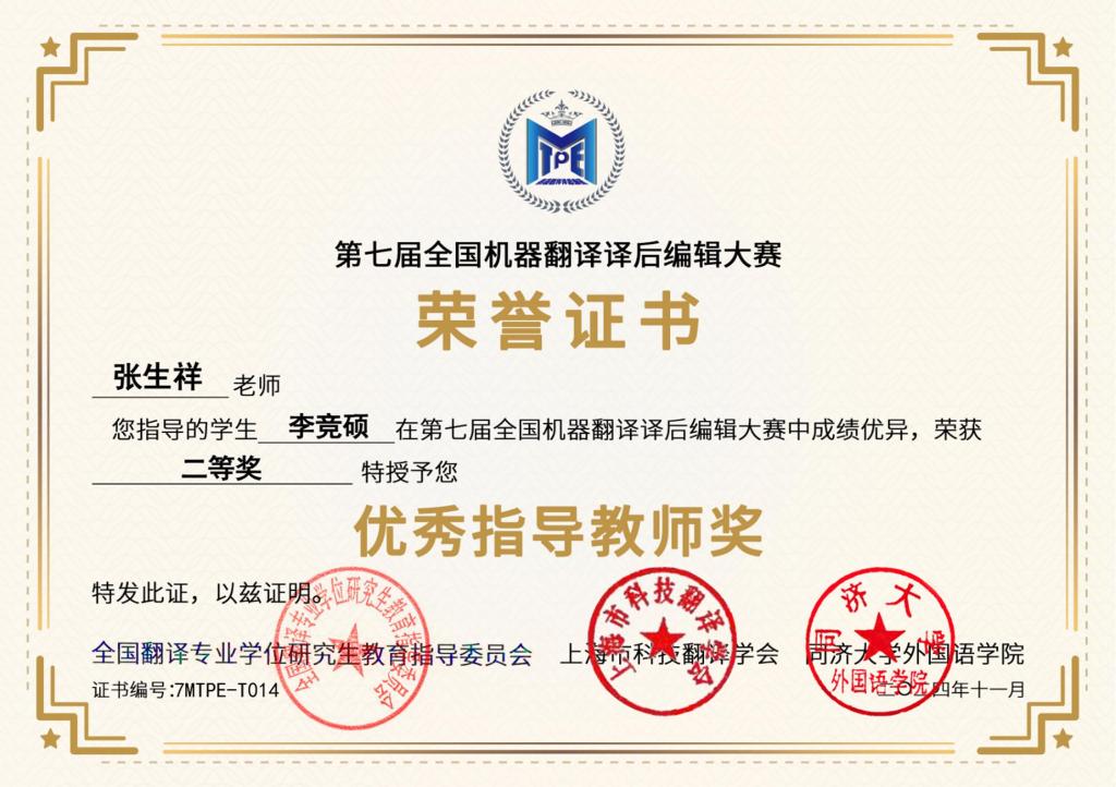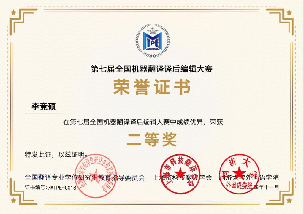 2024年11月30日,经过数月的激烈角逐,第七届全国机器翻译译后编辑大赛圆满落下帷幕,获奖名单正式揭晓。我院2023级翻译硕士李竞硕在张生祥教授的指导下荣获二等奖,为学院赢得荣誉。